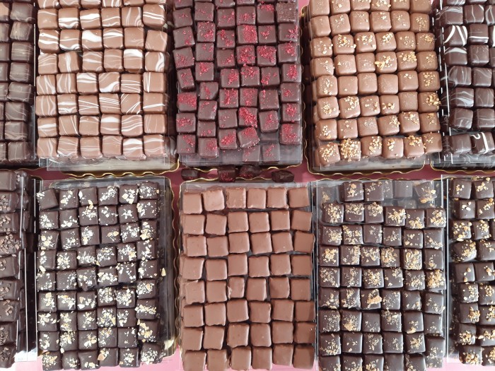 Assortiment de chocolats fourrés : praliné, ganache, pâte de fruits...