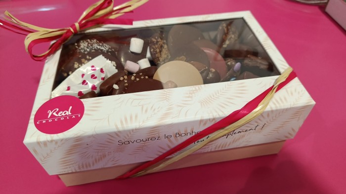 * assortiment de chocolats au lait fourrés : praliné, ganache, pâte de fruits... Divers arômes ou inclusions: sésame, fève de cacao, royaltine, amande, noisette, framboise, passion...