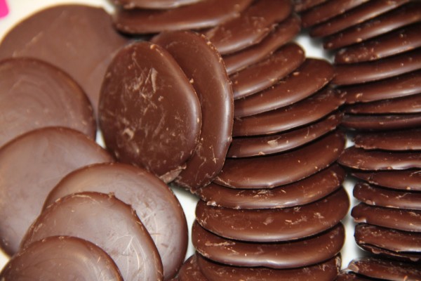 Assortiment de palets de chocolat: chocolat fin (noir et lait) sur lesquels sont déposés des ingrédients tels que brisures de framboise, éclats de noisettes, brisures de biscuits... 200 gr.